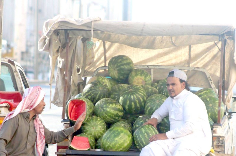 بائع يعرض «الحبحب» ثمرة الصيف المثالية والحاضرة على موائد الإفطار والسحور في رمضان. (تصوير: علي بدير)