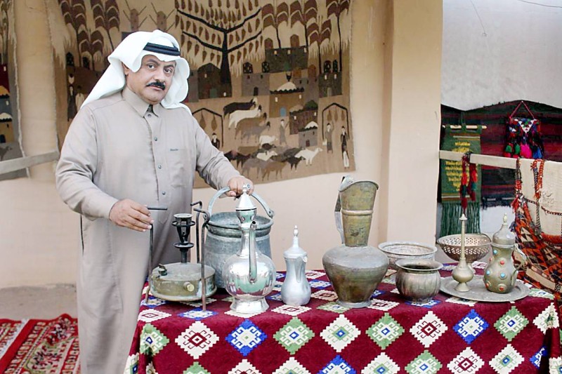 بائع يستعرض بعض المقتنيات التراثية القديمة في قلعة تبوك الأثرية.