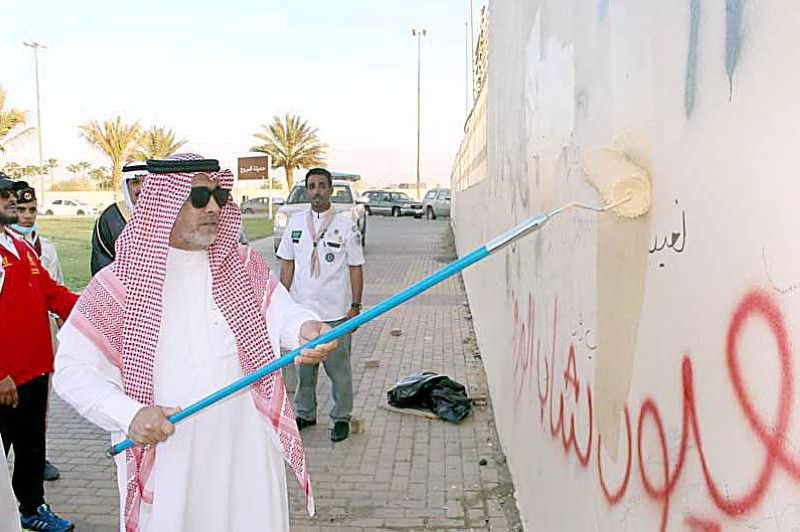 فريق تبوك التطوعي خلال مشاركته في أعمال معالجة التشوه البصري من خلال إزالة الكتابة على الجدران.