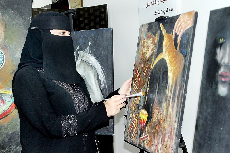 التشكيلية صبيحة العطوي تضع بريشتها اللمسات النهائية على إحدى لوحاتها في معرض الفن التشكيلي بأدبي تبوك.