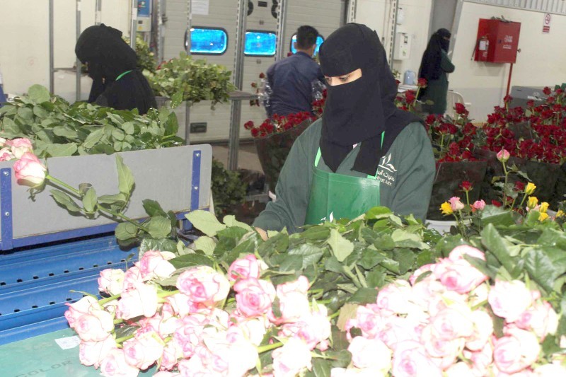 البائعة ندى تنسّق الزهور في إحدى مزارع الورود بتبوك. (تصوير: علي بدير)