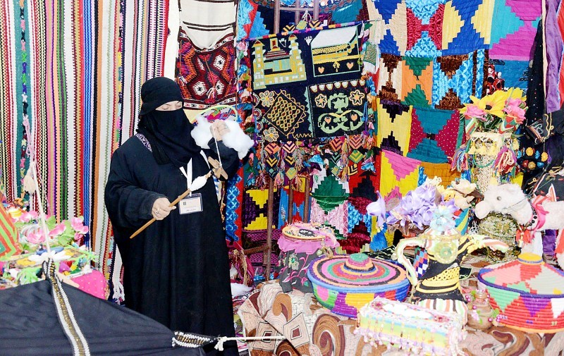 سيدة خلال مشاركتها في الحِرَف التراثية بالحدود الشمالية تحاكي تاريخ الآباء والأجداد. (واس)
