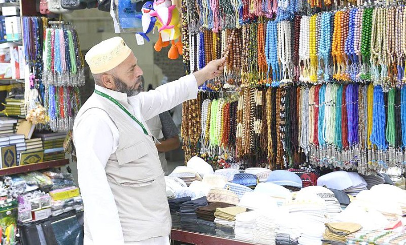 قبل الوداع والتوجه إلى أوطانهم، يحرص الحجاج على شراء هدايا تذكارية من مكة المكرمة والمدينة المنورة توثيقاً لرحلتهم الدينية. (واس)
