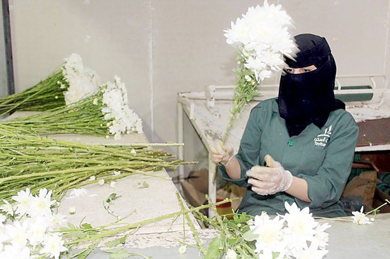 عاملة تنسق باقات الورود في إحدى مزارع تبوك.