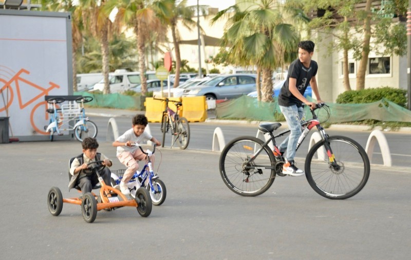 أطفال يروحون عن أنفسهم بركوب الدراجات الهوائية على ممشى الواجهة البحرية في جدة.
