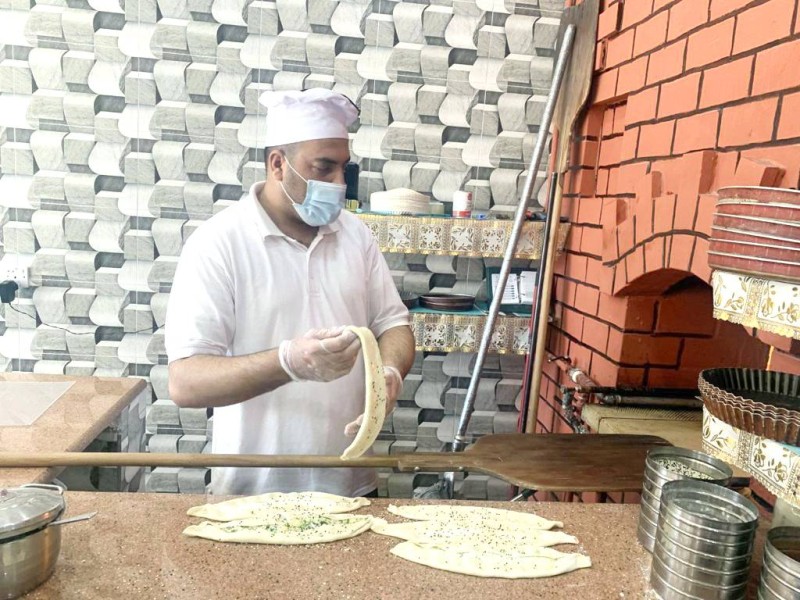عامل يجهز المخبوزات والمعجنات في أحد الأفران بتبوك. (تصوير: علي بدير)