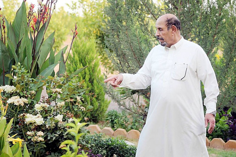 المزارع محمد القيسي، يتفقد وروداً تمت زراعتها في أحد المشاتل بتبوك.