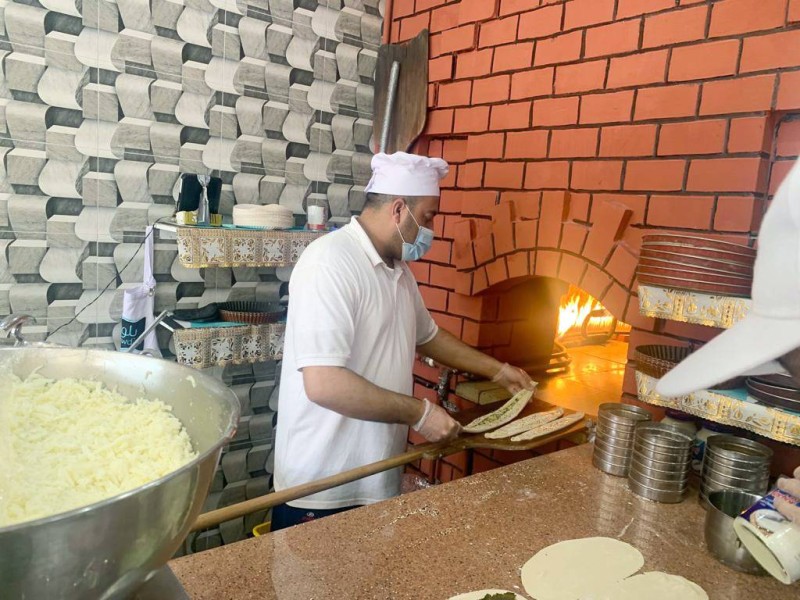 عامل يقف خلف أحد الأفران لتجهيز المعجنات والفطائر في تبوك. (تصوير: علي بدير)