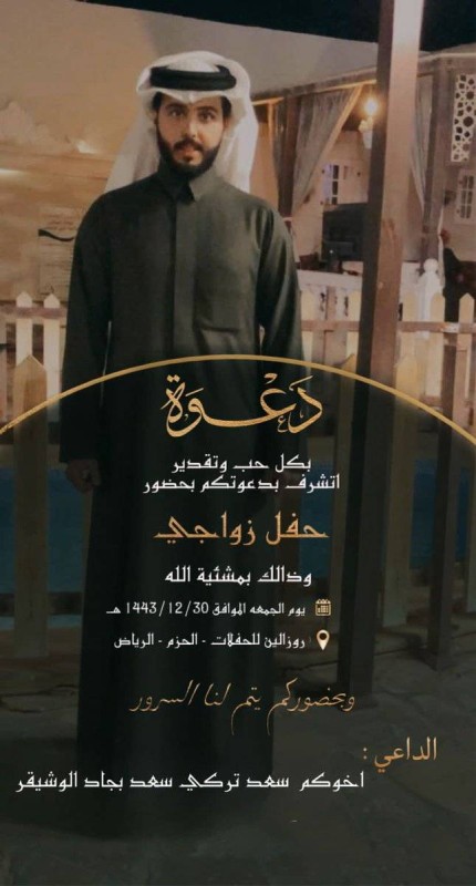 احتفل الشاب سعد بن تركي الوشيقر بزواجه من كريمة حمود بن بتال الوشيقر، في إحدى قاعات الأفراح في الرياض، وسط حضور عدد من الأقارب والأهل والأصدقاء. وأعرب العريس عن شكره لكل من شاركه الفرحة.