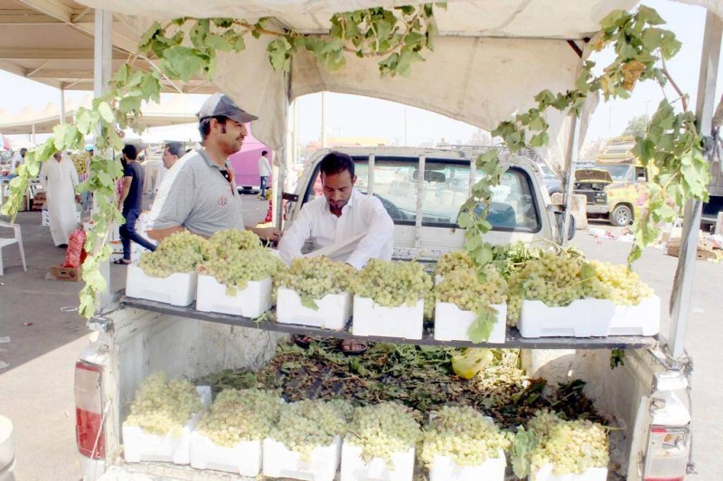 حسين الجابري يستعرض بضاعته من العنب في سوق الخضار بتبوك.