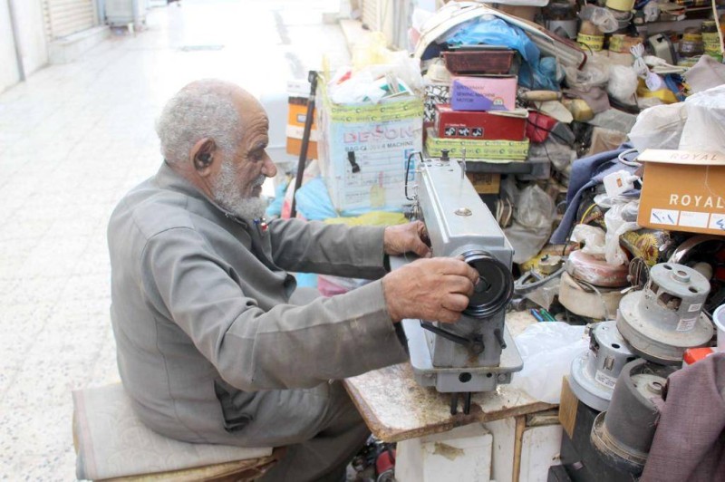 عبده ناجي يمارس مهنة إصلاح مكائن الخياطة لأكثر من 50 عاماً في جادة تبوك. (تصوير: علي بدير)