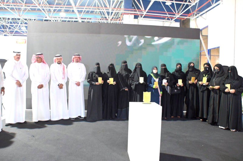 الدكتور نايف الزارع والمهندس وسام حابس مع المعلمات المكرمات في الحفل. (تصوير: فيصل الحارثي)