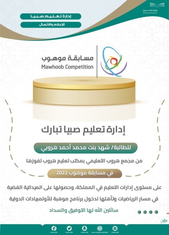 حصلت الطالبة شهد محمد هروبي من إدارة تعليم صبيا بالصف الأول المتوسط، على الميدالية الفضية في مجال الرياضيات بعد اجتيازها اختبار موهوب 2 وذلك بعد إعلان موهبة لنتائج 28 إدارة تعليمية، حيث بلغ عدد المختبرين 2300 وإجمالي الأوائل 111 طالباً وطالبة بواقع 14 ميدالية ذهبية، و34 ميدالية فضية، و63 ميدالية برونزية، وسيدخل المجتازون برنامج موهبة للأولومبيادات الدولية.