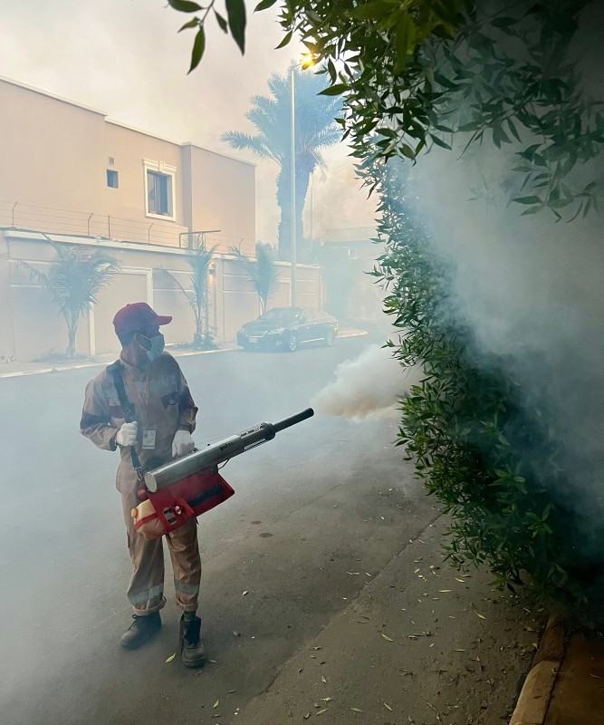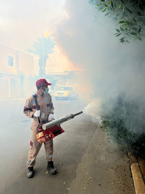 عامل يرش الأشجار بالدخان لطرد الناموس الذي يسبب حمى الضنك. (تصوير: عبدالسلام السلمي)