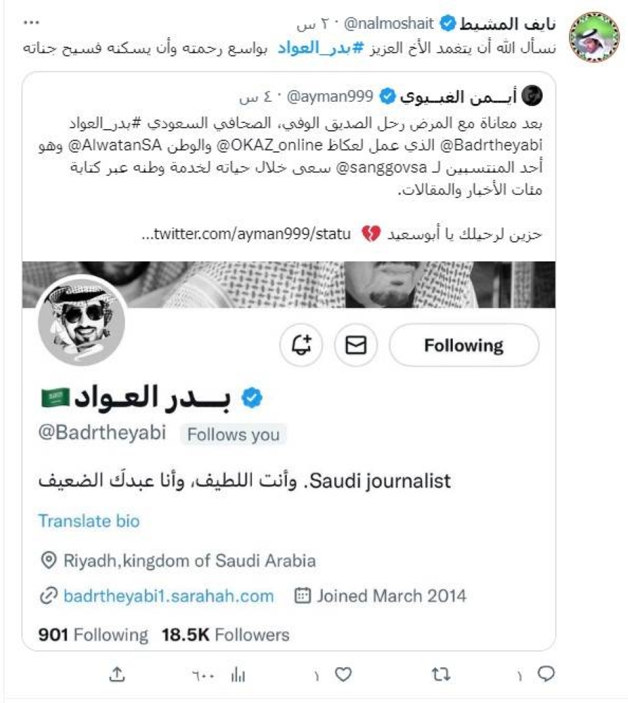 فيما كتب رئيس تحرير صحيفة الوئام الإلكترونية نايف المشيط: «نسأل الله أن يتغمد الأخ العزيز بدر العواد بواسع رحمته وأن يسكنه فسيح جناته».