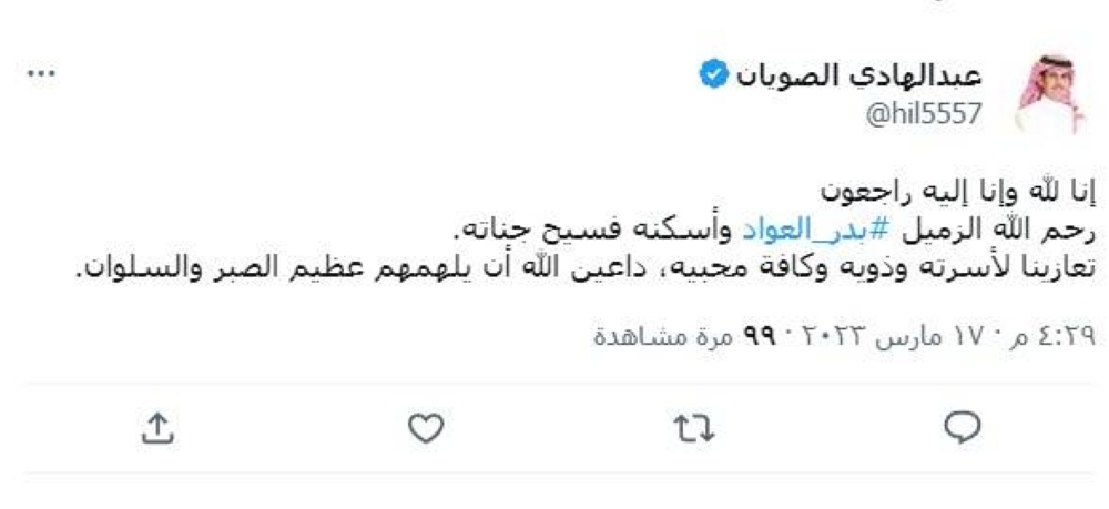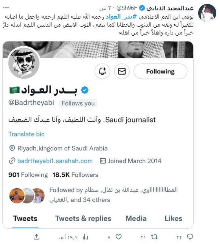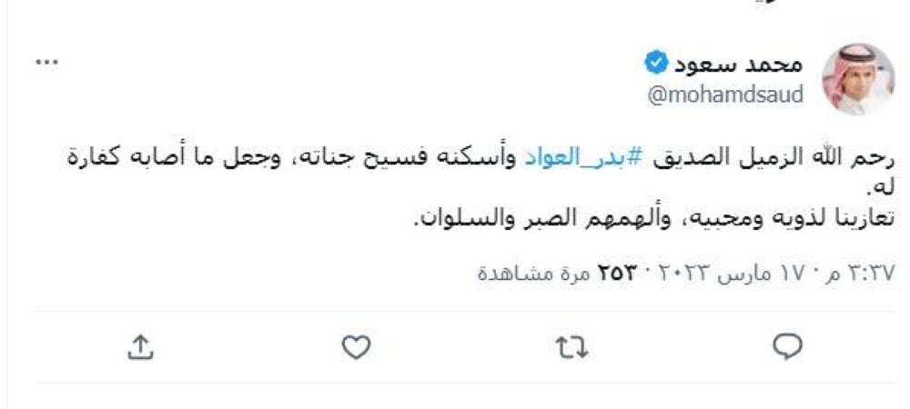 وكتب الشاعر عبدالمجيد الذيابي تغريدة نعى فيها الراحل: «توفي ابن العم الإعلامي بدر العواد رحمة الله عليه. اللهم ارحمه واجعل ما أصابه تكفيراً له ونقه من الذنوب والخطايا كما ينقى الثوب الأبيض من الدنس. اللهم أبدله داراً خيراً من داره وأهلاً خيراً من أهله».