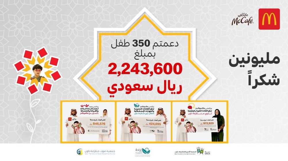 وقد سلم نائب الرئيس العام في شركة الرياض العالمية للأغذية (ماكدونالدز السعودية) الأمير ماجد بن فهد آل سعود، شيكات المبالغ في مقر الشركة بالرياض لكل من المدير التنفيذي لجمعية صوت متلازمة داون زينة زيدان، والمدير المالي والإداري لجمعية دسكا مها القرعاوي، ونائب مدير جمعية إرادة علي سالم آل مخلص.