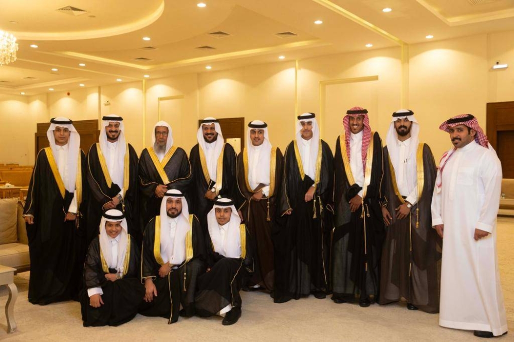 العريس محاطاً بأقاربه في الحفل. (عكاظ)