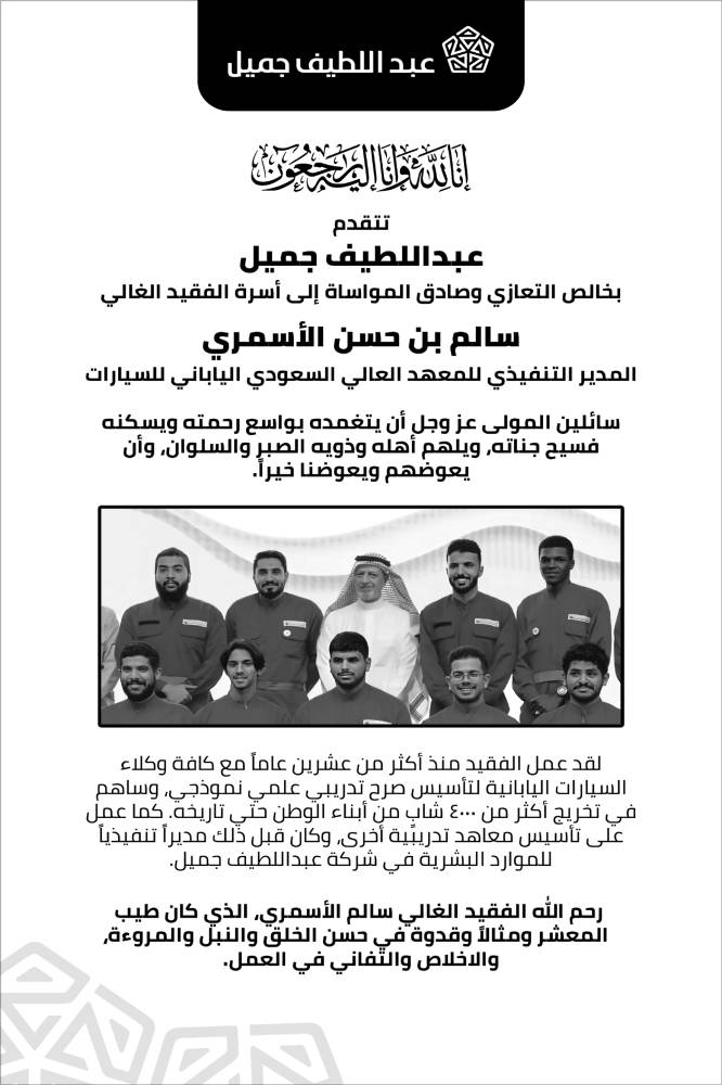 تقدم منسوبو شركة عبداللطيف جميل بخالص التعازي وصادق المواساة إلى أسرة المدير التنفيذي للمعهد العالي السعودي الياباني للسيارات سالم الأسمري، الذي انتقل إلى رحمة الله، سائلين الله أن يتغمده بواسع رحمته ويسكنه فسيح جناته ويلهم أهله وذويه الصبر والسلوان، وأن يعوضهم خيراً.