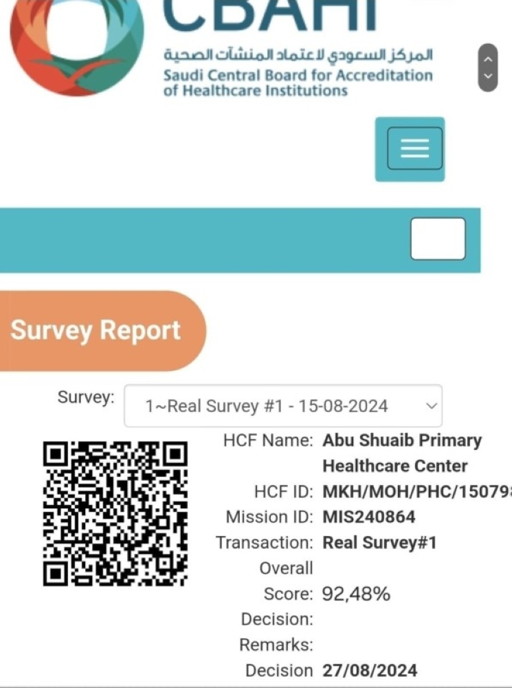 حصل مركز الرعاية الصحية الأولية بأبي شعيب في محافظة الجموم على شهادة الجودة (سباهي) بعد أن اجتاز التقييم وتطبيق معايير الجودة وسلامة المرضى في الرعاية الصحية الأولية. وقدم محافظ الجموم محمد بن ماضي السبيعي وإدارة القطاع الصحي بالجموم وإدارة المركز الشكر لأهالي القرية على دعمهم وتفاعلهم الإيجابي ومشاركتهم الفعالة في حصول المركز على هذه الشهادة.