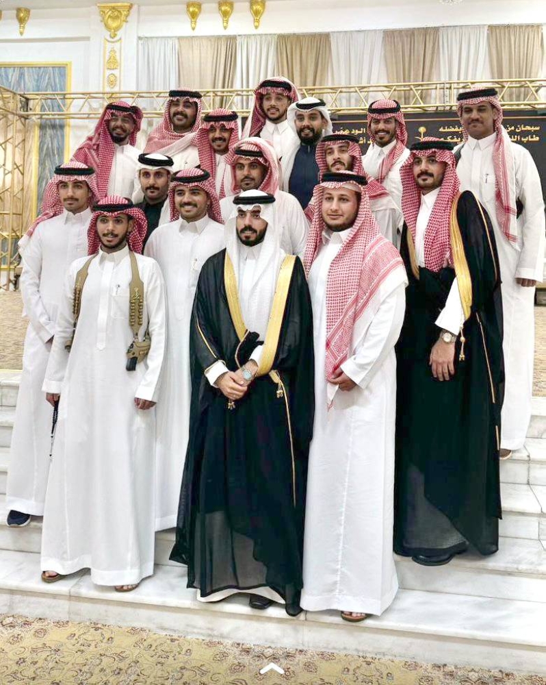 العريس محاطاً ببعض الحضور. (عكاظ)