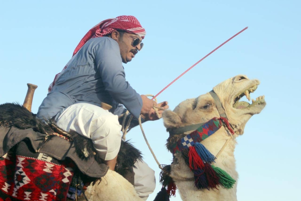 أحمد العطوي خلال ترويضه الجمل، في مضمار الإبل بتبوك؛ لقيادته وركوبه، ولهذا يجب أن يعامل الجمل بسلوك هادئ وبرفق حتى يعتاد على قائده. (تصوير: علي بدير)