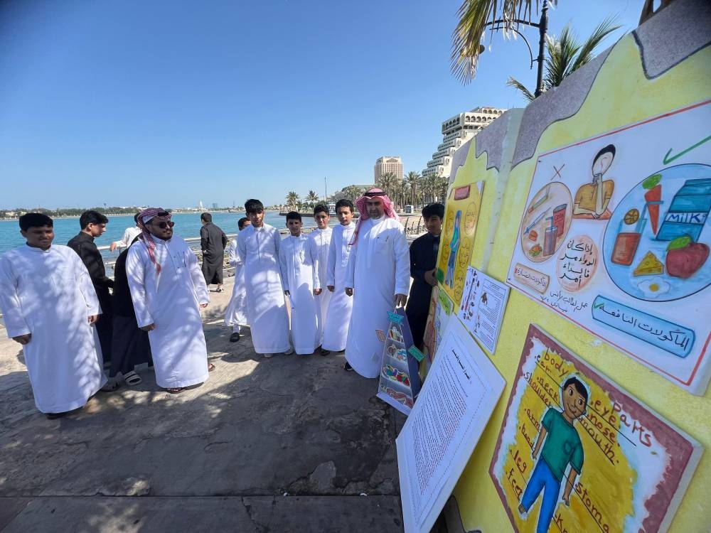 من جهته، أكد منسق الأنشطة رائد النشاط بالمدرسة علي القرني أن الهدف من خروج الأنشطة والفعاليات خارج أسوار المدرسة هو فتح المجال للمجتمع لمشاركة المدرسة برامج مسؤوليتها المجتمعية، وقال: المعرض التوعوي الذي أقيم على كورنيش جدة تضمن أعمالاً للطلاب حول مبادرة أمش 30، إضافة إلى لوحة لأخذ توقيعات الزوار على الالتزام بالمشي اليومي بغرض الوصول لأطول لوحة لتعزيز الصحة في موسوعة غينيس للأرقام القياسية.