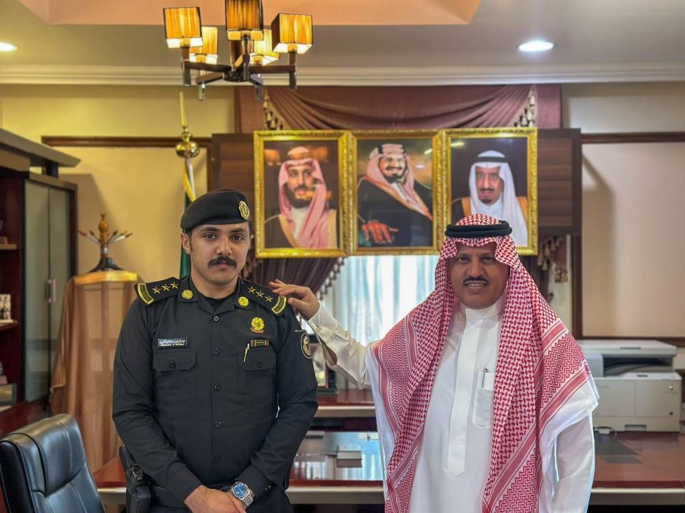 The Governor of Umluj, Nayef Al-Marihi, yesterday (Wednesday), at the governorate headquarters, awarded the new rank to the Director of Security Patrols in Umluj, Captain Abdulrahman Sultan Al-Harbi, following the issuance of the royal decree promoting him.
