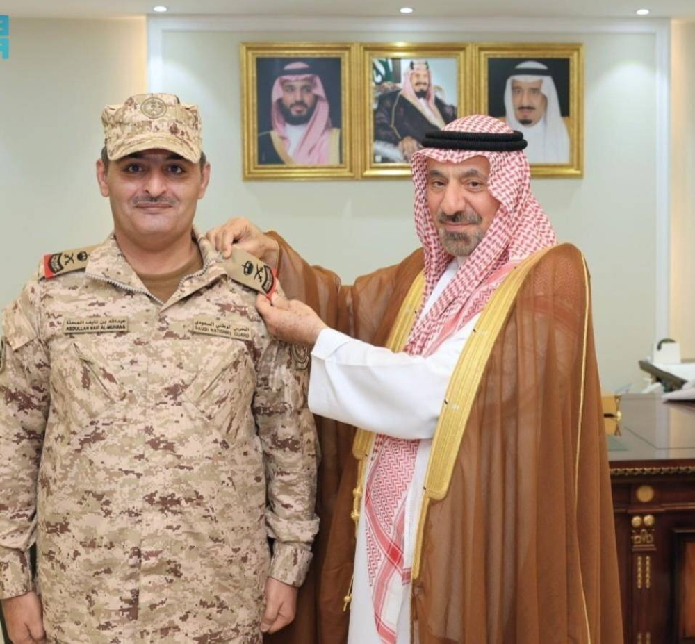 The Prince of Najran, Prince Jalwa bin Abdulaziz bin Musaid, yesterday (Wednesday) at his office, awarded the new rank of Brigadier General to the Assistant Commander of the Prince Turki Al-Awwal Brigade in the National Guard, Brigadier General Abdullah bin Naif Al-Muhanna Al-Mutairi, following the issuance of the royal decree promoting him to the rank of Brigadier General.