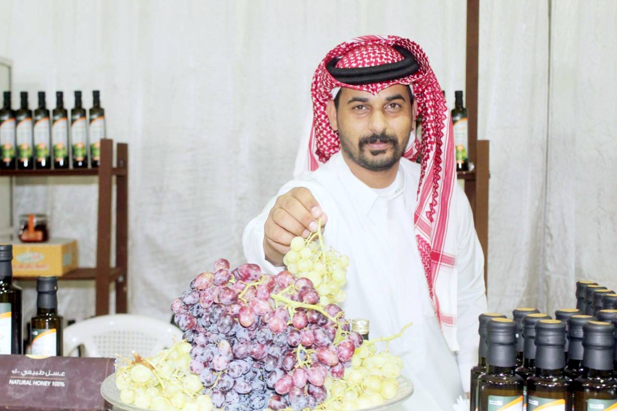 Farmer Abdulaziz Al-Anzi showcases the grapes, which are considered one of the promising economic fruits, as they are characterized by abundant production and successful cultivation over a wide range. (Photo: Ali Bdeir)