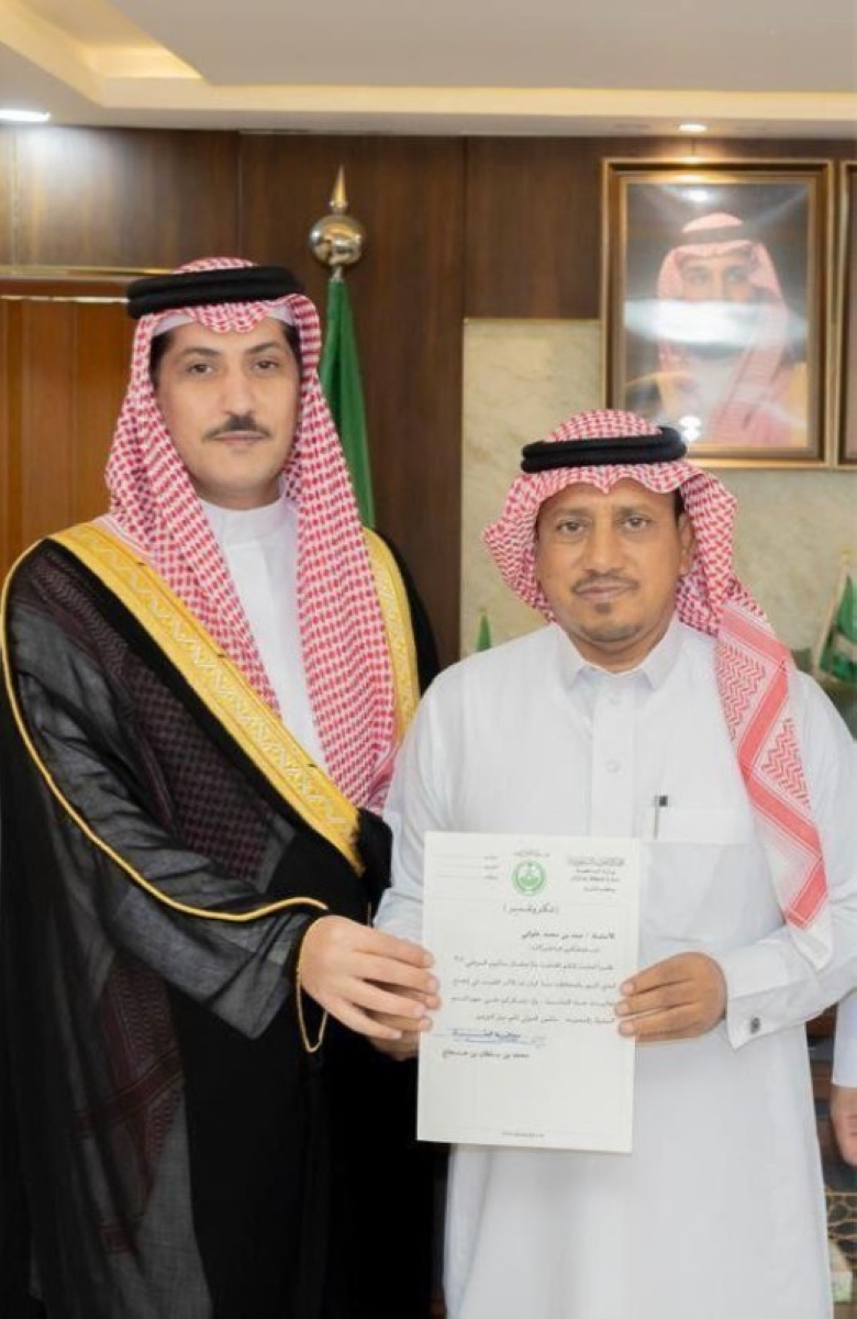 The Governor of Al-Harith, Mohammed bin Sultan bin Hajjaj, honored the "Okaz" reporter in the Jazan region, colleague Abdu Alwani, for his participation in the events celebrating National Day.