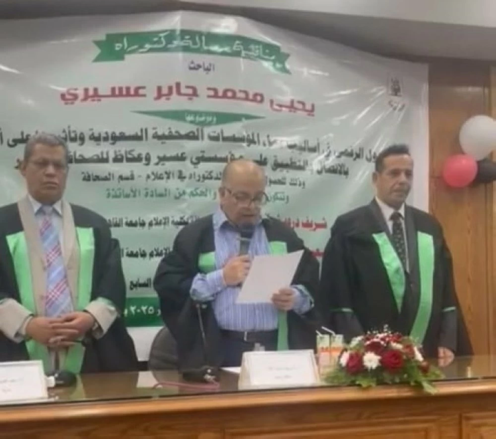 Media colleague Yahya Jaber has obtained a PhD in Journalism and Media with first-class honors from Cairo University - Faculty of Media. Jaber combined his professional practice in media with academic pursuits; in his professional side, he spent 33 years as a journalist, during which he worked for several Saudi newspapers, including "Al-Jazirah," "Okaz," "Al-Watan," and "Al-Hayat." He currently serves as the Director of Institutional Communication and Media in the practical communication sector and lectures at various training institutes in Saudi Arabia within his specialty, as well as at several universities and others.