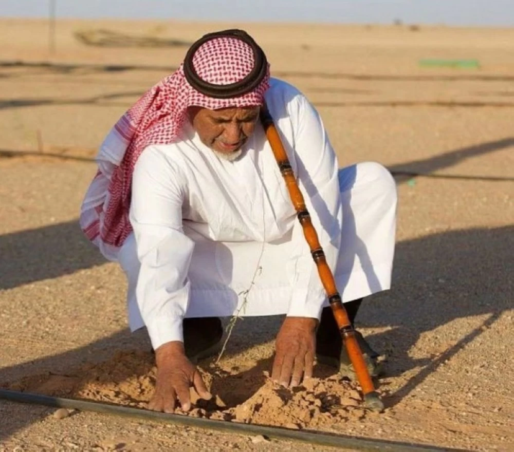 One of those interested in combating desertification by measuring the soil and working to increase vegetation cover in the Al-Tayma Governorate. (Photo: Ali Bdeir)