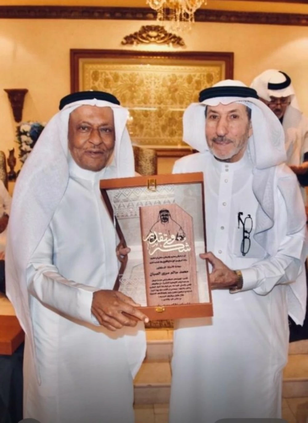 Former advisor Fouad Mohammed Helmy honored the economic advisor Dr. Mohammed Salem Surour Al-Sabban by presenting him with an honorary shield at his home in Jeddah.