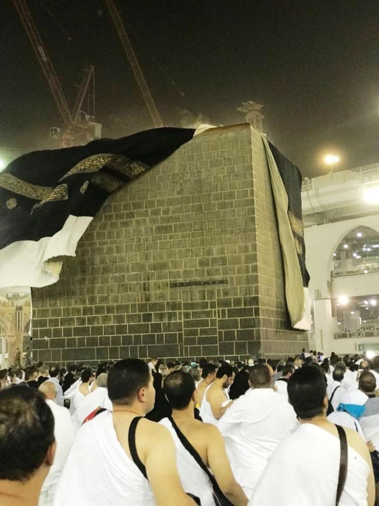 لأول مرة.. شاهد ملايين المسلمين في بقاع المعمورة حجارة وبناء الكعبة المشرفة بعد أن هبت رياح شديدة مساء اليوم (الأحد) وكشفت ثوب الكعبة المشرفة ما استوقف الكثير من المصلين والزوار أمام المشهد النادر، وكان الفريق المعني بوضع ثوب الكعبة المشرفة الجديد شرع في تحرير أركان الكسوة من المذهبات ظهر الثامن من شهر ذي الحجة، حسب الخطة التشغيلية والفنية لتبديل الثوب القديم بالجديد، إذ كانت المذهبات عبارة عن ستارة باب الكعبة المشرفة المصنوعة من الذهب الخالص بالجهة الشرقية، 4 صمديات تتضمن سورة الإخلاص والموجودة في الأركان الأربعة و4 قناديل (الله أكبر) مثبتة عند خطة النية. ويتم استخدام رافعة للوصول إلى سطح الكعبة المشرفة و(سقالات).