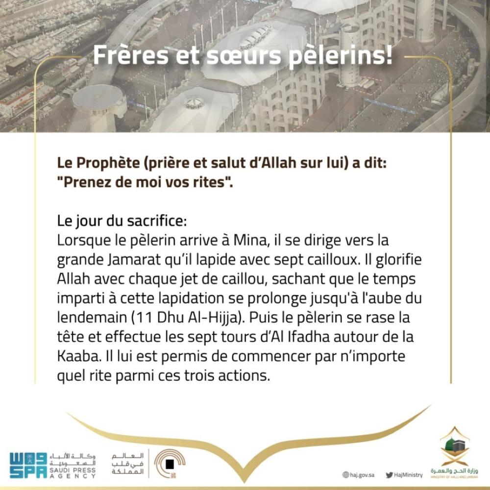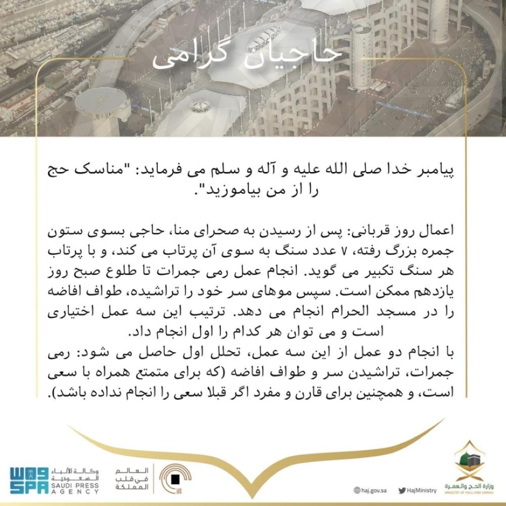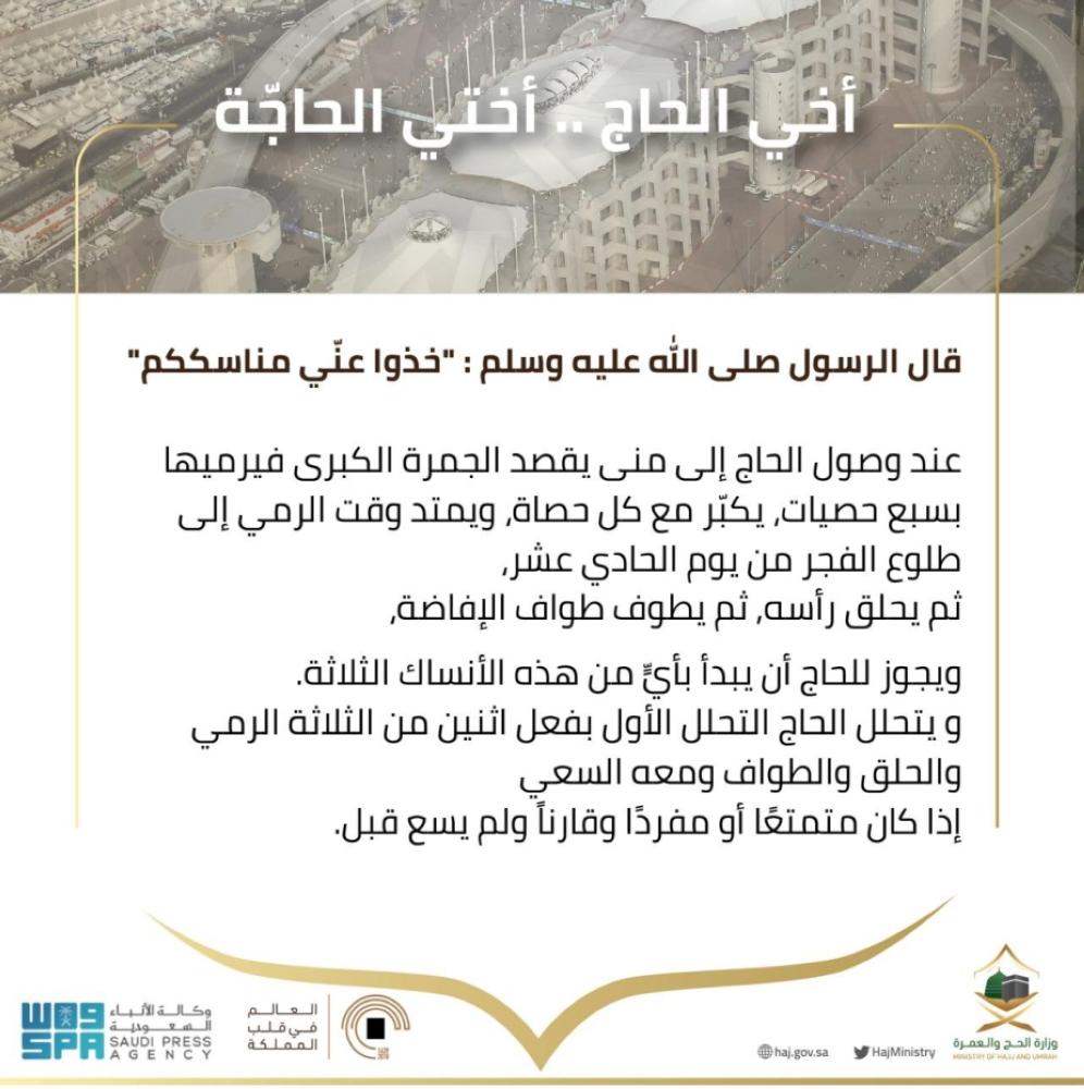 جاء ذلك في رسائل توعوية وجهتها لضيوف الرحمن اليوم، وهي: أخي الحاج.. أختي الحاجة قال الرسول صلى الله عليه وسلم: «خذوا عنّي مناسككم» أعمال يوم النحر:
