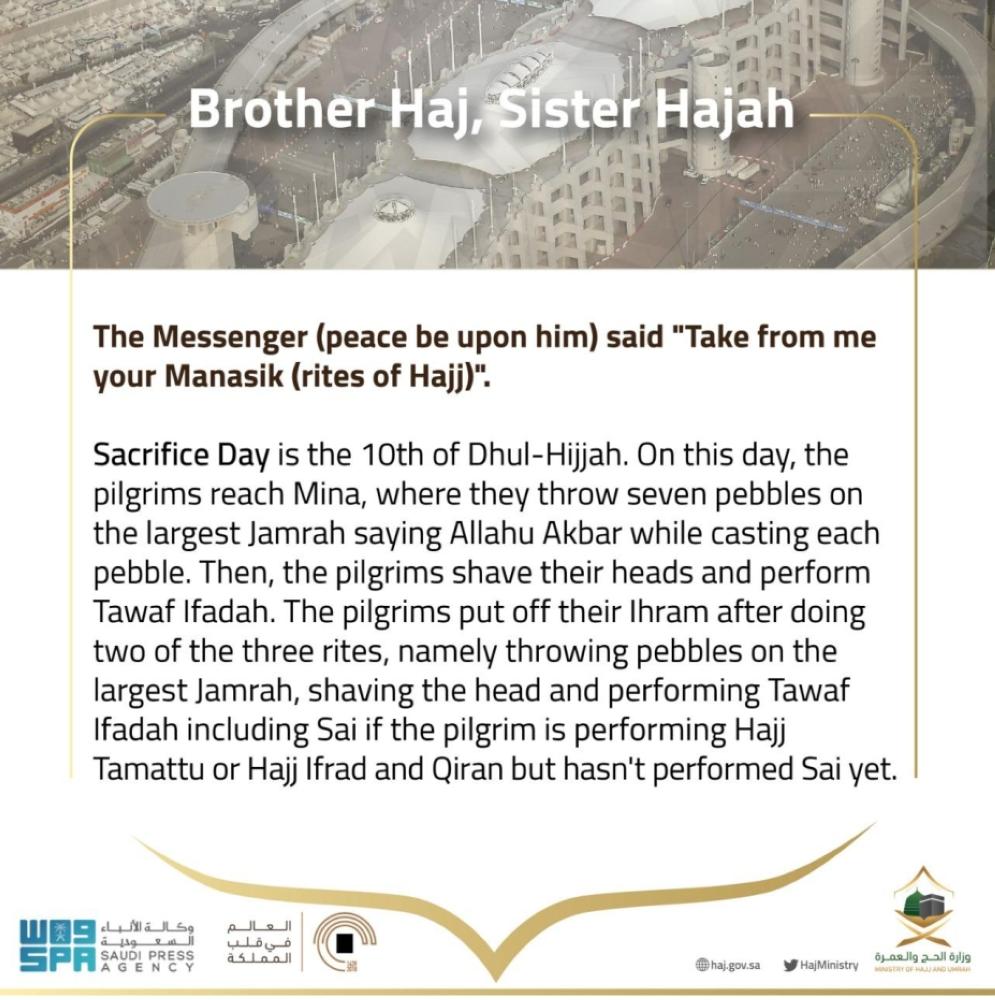 عرّفت وزارة الحج والعمرة حجاج بيت الله الحرام بأعمال يوم النحر.