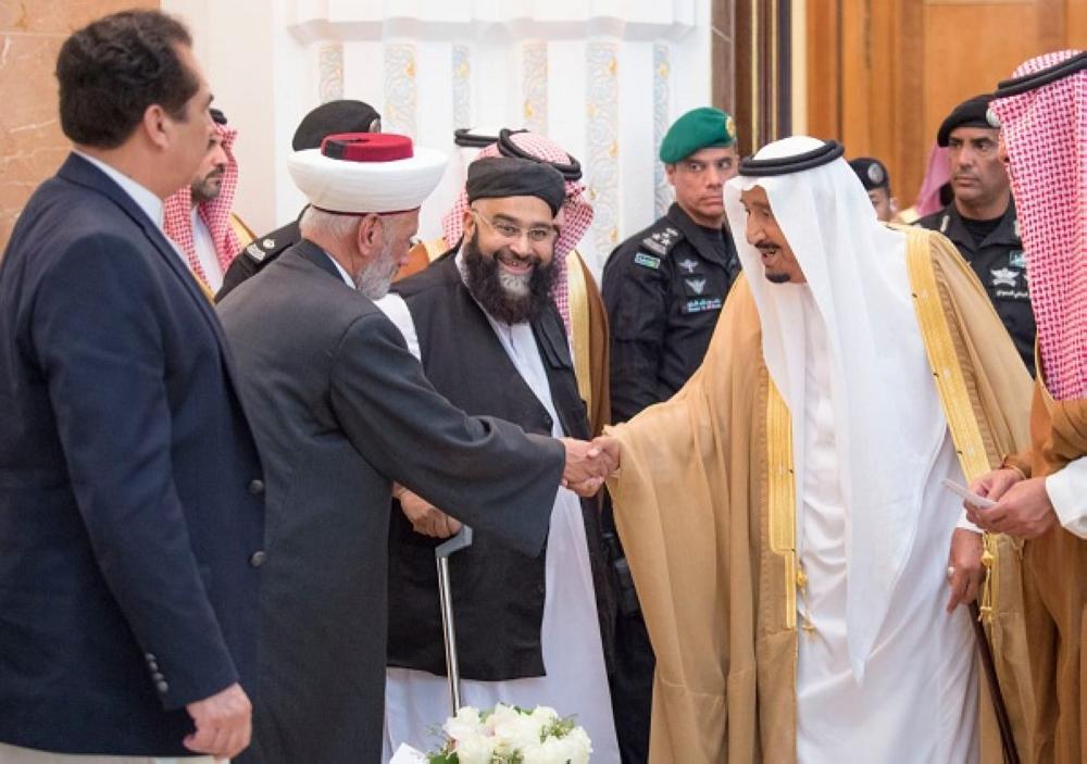 الملك سلمان مصافحا أحد الضيوف من رجال الدين