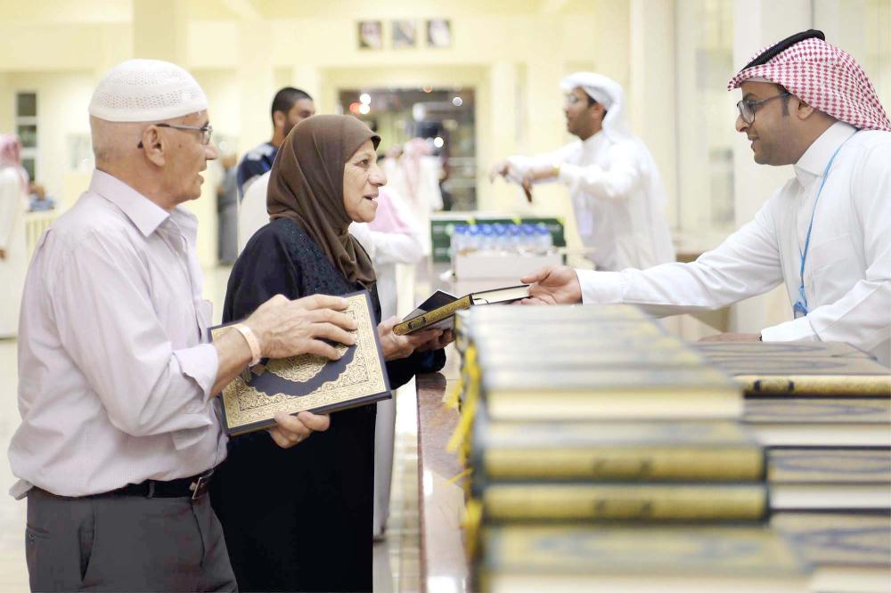 موظف في المنفذ يسلم حاجة هدية خادم الحرمين نسخة من القرآن الكريم. (عكاظ)