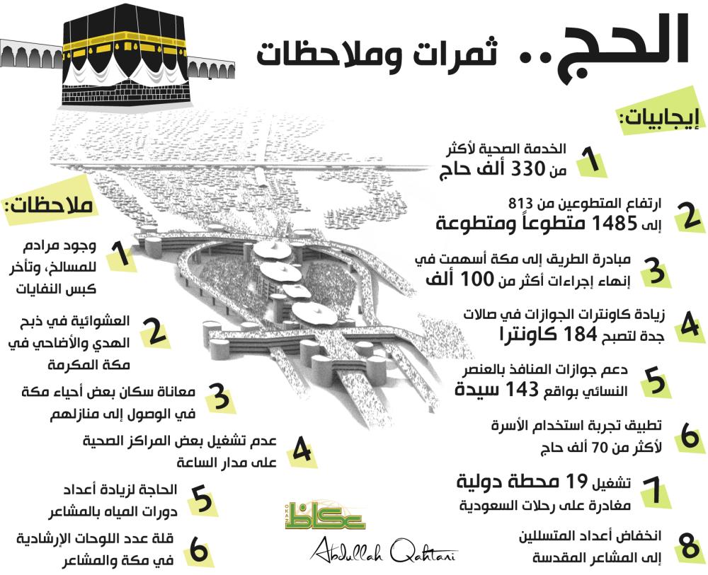 ومن الإيجابيات استحداث حاضنات الأطفال الموسمية، والتوسع في استقطاب الراغبين في العمل التطوعي، تخصيص كامل صحن المطاف والأدوار المطلة عليه والسطح للطائفين، وتفويج الحجاج من الجمرات إلى المسجد الحرام بانسيابية، إضافة إلى الاستفادة من جميع مساحات المسجد الحرام بما في ذلك التوسعة، وفتح الأنفاق الشمالية وتحديد الطاقة الاستيعابية لمرحلة القدوم في المطار بــ 45 ألف حاج في اليوم الواحد، والتزام كافة الجهات الحكومية العاملة في المطار بتطبيق الخطط التشغيلية والعمل بروح الفريق الواحد، كما أسهم تظليل ممرات المشاة في تقليل الإصابة بالإجهاد، وتوفير فرق طبية مخصصة لنقل الحجاج المنومين لإكمال نسكهم، ووفرة المواد الغذائية والتموينية وزيادة ضبطيات المواد الاستهلاكية المخالفة بنسبة 30% عن العام الماضي، وزيادة كفاء أعمال النظافة، وانخفاض معدل الهدر في عبوات المياه المعبأة وفاعلية إعادة توزيع مواقع البرادات الخيرية، أيضا انتشار رشاشات المياه في المشاعر والمسجد الحرام ما كان له الأثر في خفض درجات الحرارة وتلطيف الأجواء.