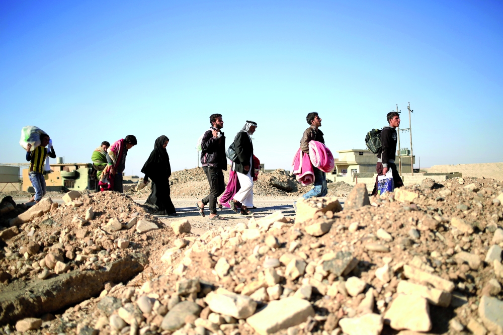 نازحون من الموصل يسيرون بأتجاه مخيم للأجئين. (أ.ف.ب)