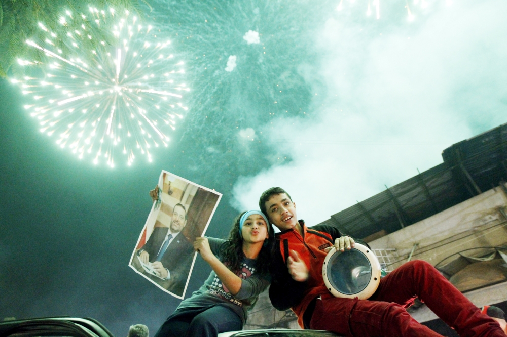 طفلة تحمل صورة لرئيس الوزراء اللبناني المكلف سعد الحريري خلال احتفال في بيروت أمس. (ا. ف. ب)