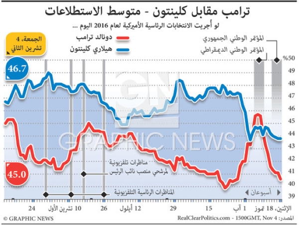 وتفاوت الفارق لصالح كلينتون بين أربع وسبع نقاط مئوية بشكل يومي الأسبوع الماضي في استطلاع رويترز/إبسوس للرأي. فيما أشارت استطلاعات رأي أخرى إلى اشتداد المنافسة. ويقدر موقع (ريل كلير بوليتيكس) الإلكتروني الذي يجمع معظم استطلاعات الرأي على مستوى الولايات المتحدة أن تفوق كلينتون تقلص من خمس نقاط في نهاية الأسبوع الماضي إلى أقل من نقطتين أمس الأول.