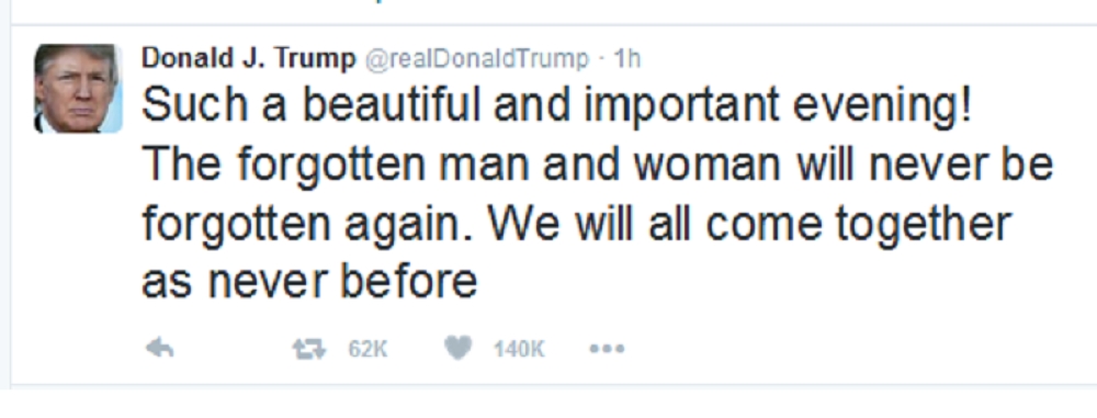 وكتب ترامب في تغريدة حوالى الساعة 11,45 ت غ: «يا لها من أمسية رائعة ومهمة، إن الرجال والنساء المنسيين لن يبقوا كذلك بعد الآن، سنتحد كما لم يحصل سابقاً».
