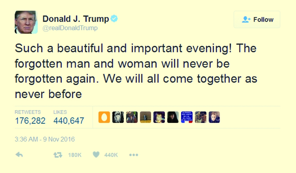 وقطب العقارات الأمريكي الذي يتابعه 13.5 مليون شخص على شبكات التواصل الاجتماعي، فاجأ أمريكا وحقق فوزا، خلافا لكل التوقعات وهزم منافسته هيلاري كلينتون. واعتمد الملياردير الشعبوي في خطاب النصر لهجة هادئة ووجه رسالة مصالحة.