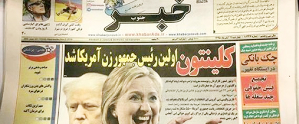 صحيفة إيرانية تنشر خبر فوز كلينتون في صفحتها الأولى. (عكاظ)