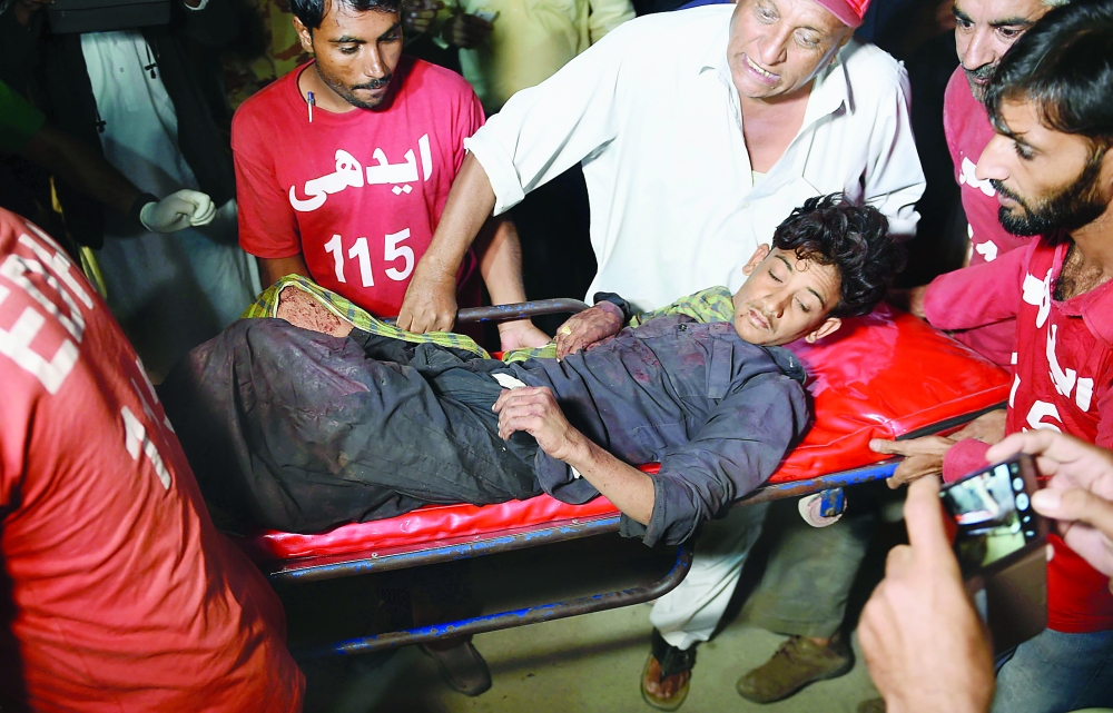 متطوعون ينقلون أحد مصابي الاعتداء الإرهابي في باكستان إلى أحد المستشفيات أمس. (أ ف ب)