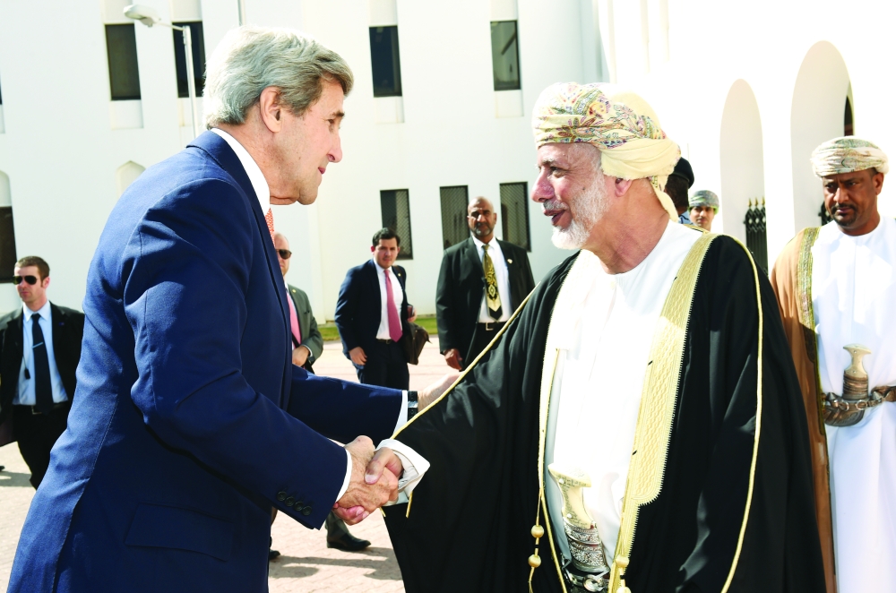 يوسف بن علوي مستقبلاً كيري في مسقط أمس. (عكاظ)