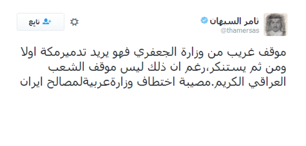 وكتب السبهان تغريده له عبر حسابه الرسمي بموقع التواصل الاجتماعي تويتر نصها: "موقف غريب من وزارة الجعفري فهو يريد تدمير مكة أولًا ومن ثم يستنكر، رغم أن ذلك ليس موقف الشعب العراقي الكريم.. مصيبة اختطاف وزارة عربية لمصالح إيران.