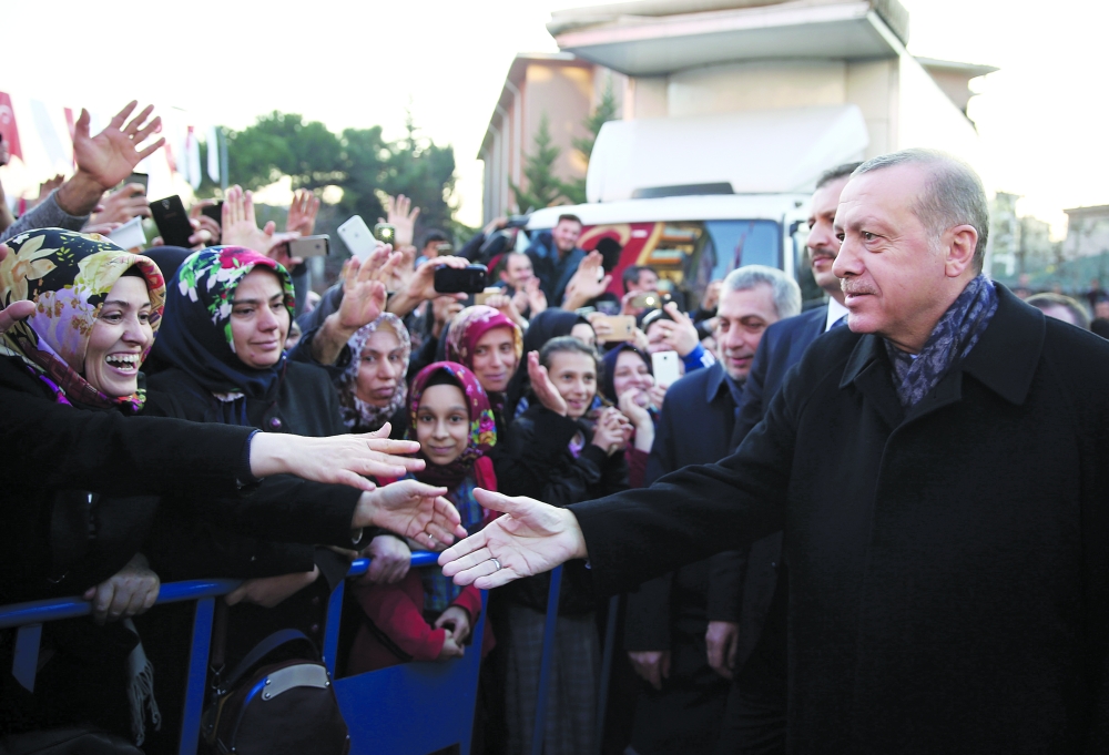 الرئيس التركي رجب طيب أردوغان مصافحا مؤيديه في مؤتمر بمدينة إسطنبول اتهم خلاله الاتحاد الأوروبي بالخيانة، مهددا بالسماح لمئات الآلاف من طالبي اللجوء وغيرهم من المهاجرين بالدخول لأوروبا. (أ.ف.ب)
